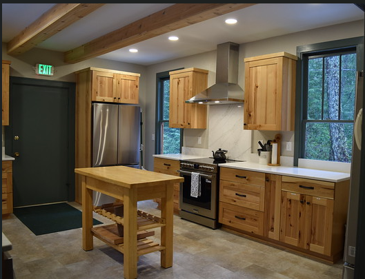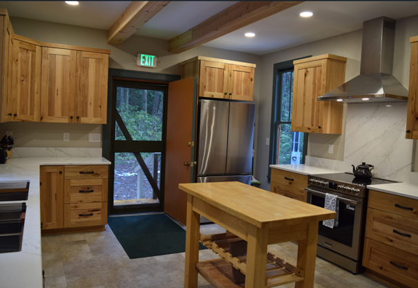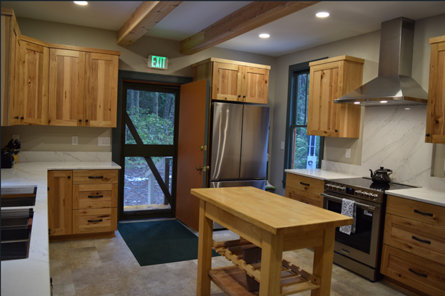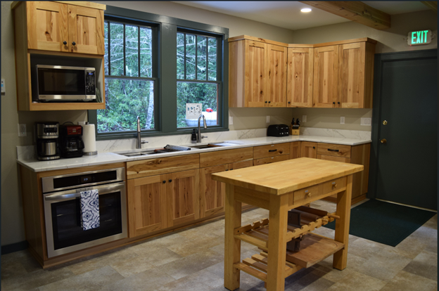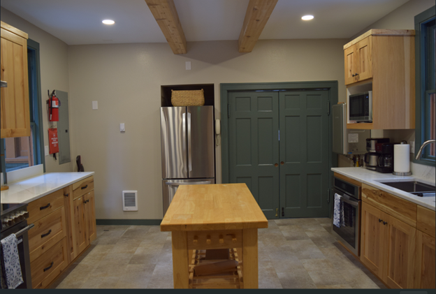 Moving through the double doors, you’ll enter the newly remodeled kitchen. You’ll find two ovens, two refrigerators, a stove, a microwave, two coffee pots, two electric griddles, and various small appliances.