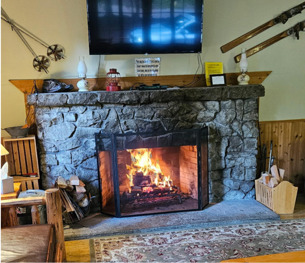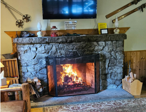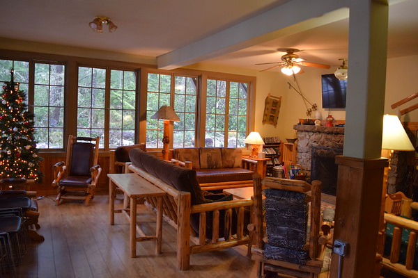 The main entrance to the lodge opens into a large main room. Two walls are lined with large windows allowing plenty of daylight and a view to the towering trees surrounding the lodge, and at times, a serene winter wonderland. Cozy up with a good book or simply relax in the living area seated around a large stone fireplace. Tables are available toward the back of the room for dining, or setting up a puzzle or a game.
